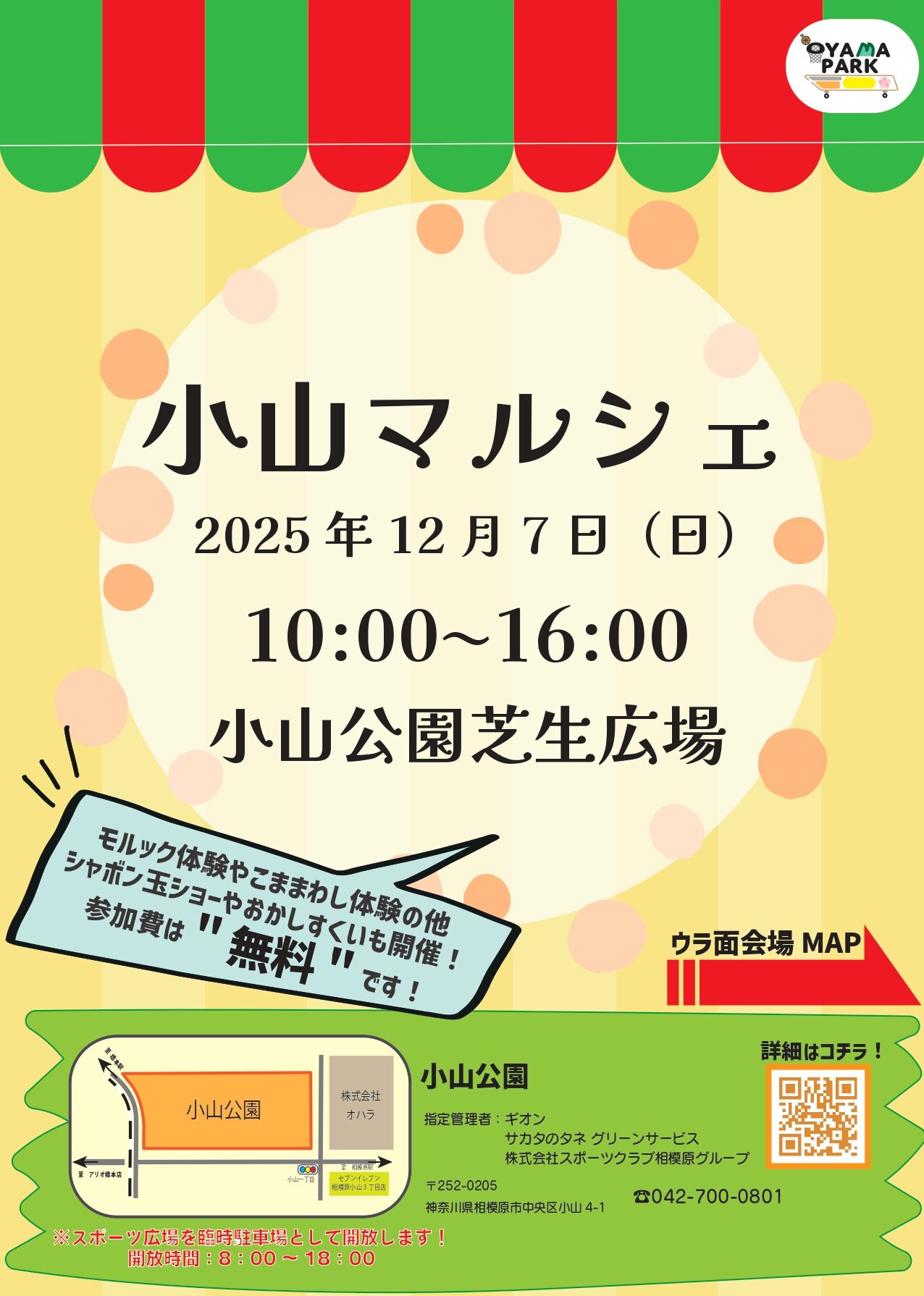 2025年12月7日(日)10:30から16:00で園内芝生広場にて小山マルシェを開催いたします。